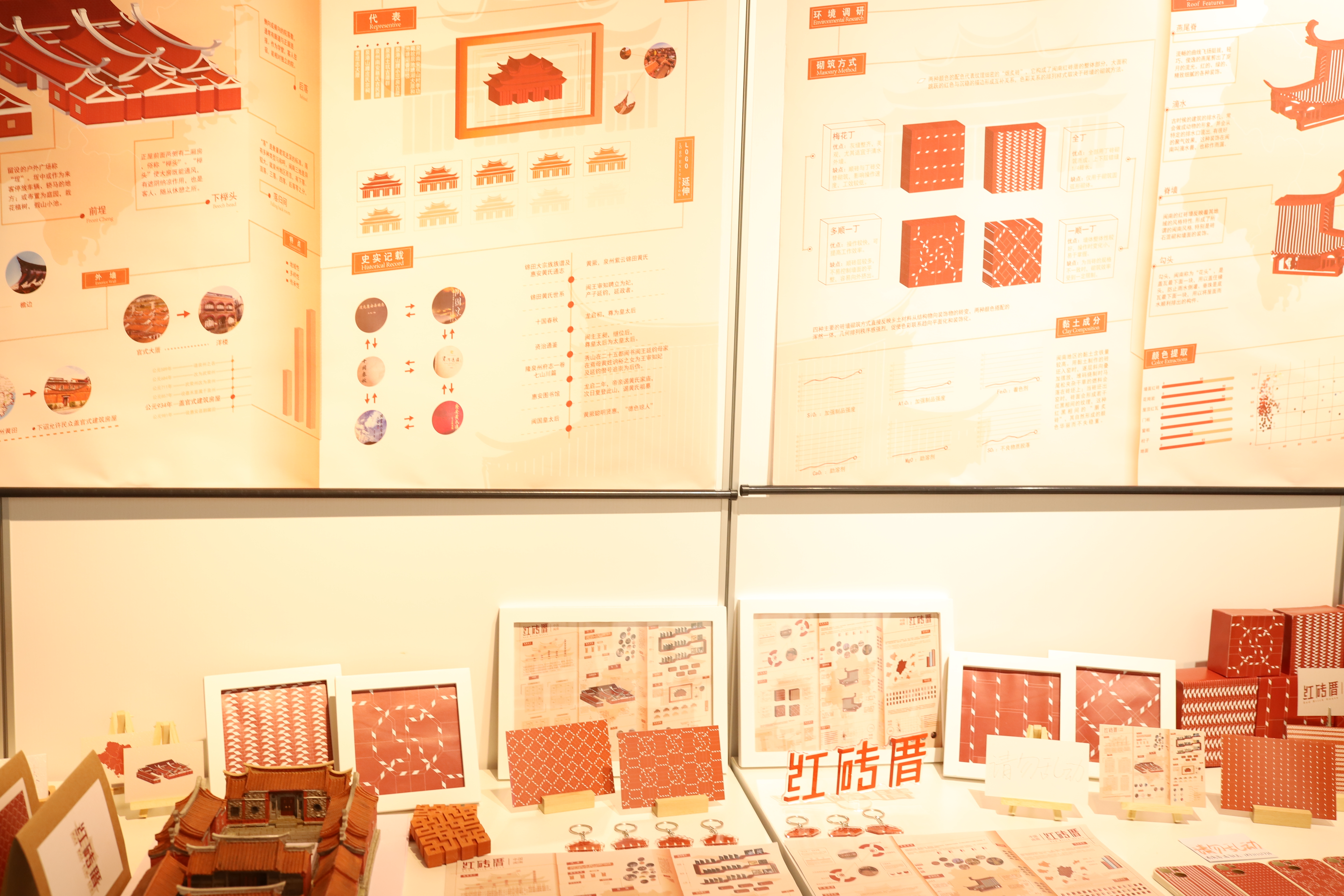 在展台,杜冰璇设置了2块展板,并以红砖厝中典型建筑——三间张为主体,分别介绍了红砖厝的历史文脉、内部结构、砌筑方式、屋顶特色等,并在展台上放置模型,供以师生观赏。