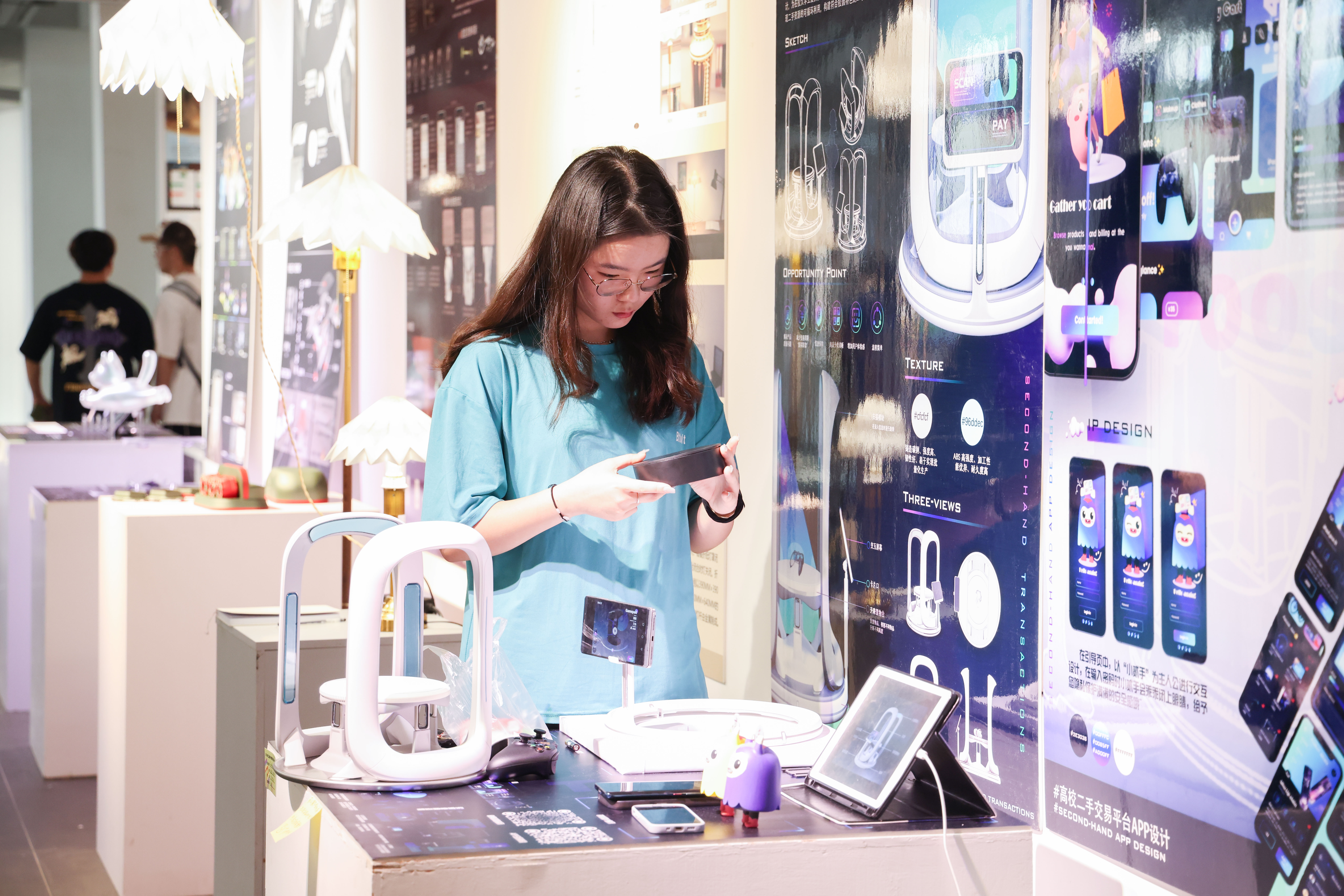 雁鱼铜灯化身爱钓鱼的打工人,VR交互重现圆明园景观,编钟形态的茶具套装,荆楚汉绣立体书,秭归脐橙IP形象设计,精美的点翠头饰、陶瓷香薰盒、楚剧汉绣……6月6日,bat365在线平台登录第五届设计艺术节开幕,集中展示了1415件艺术设计及相关优秀作品,既关注传统,又服务当下,尽显“00后”大学生天马行空的想象力。